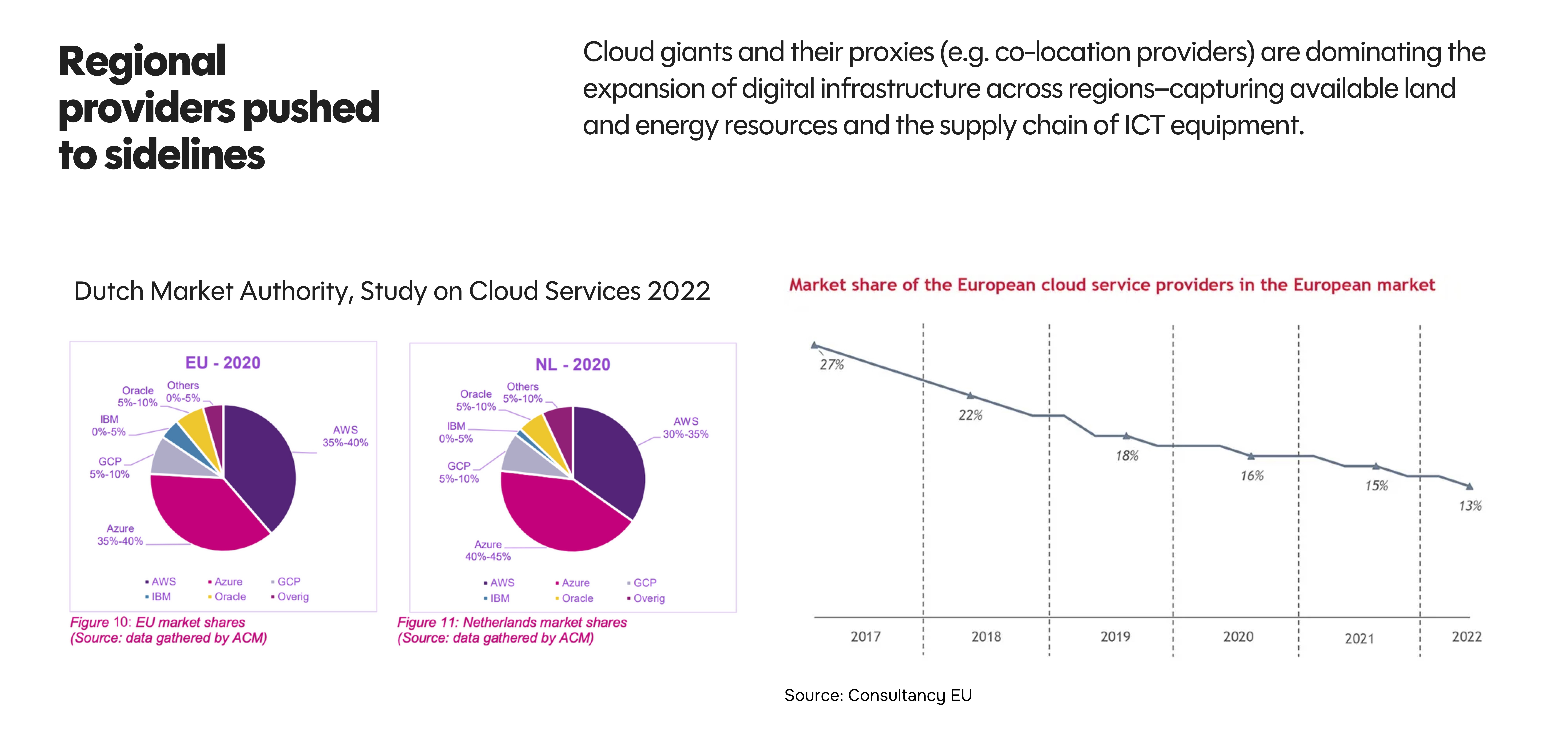 Let’s take cloud services as an example. Most European businesses depend heavily on American providers like Microsoft and Amazon for cloud storage. According to research in 2022, American big tech leaders wield a significant portion of the regional market for cloud service providers. European providers have struggled to compete, and their market share was in a state of decline.