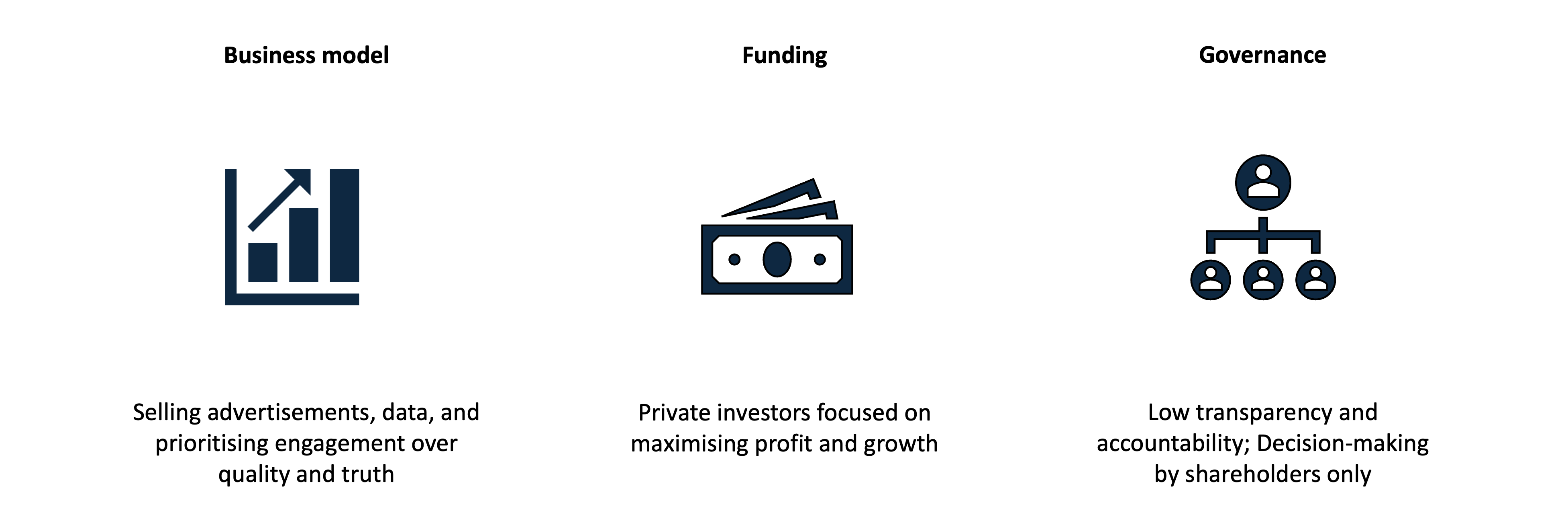 Even though these platforms impact our society and our interactions, there is no representation or voice in the decision-making process from users, citizens, or the public sector. These structural choices lead directly to the outcomes we see today such as polarisation, misinformation, lower trust, and a weakened democracy.
